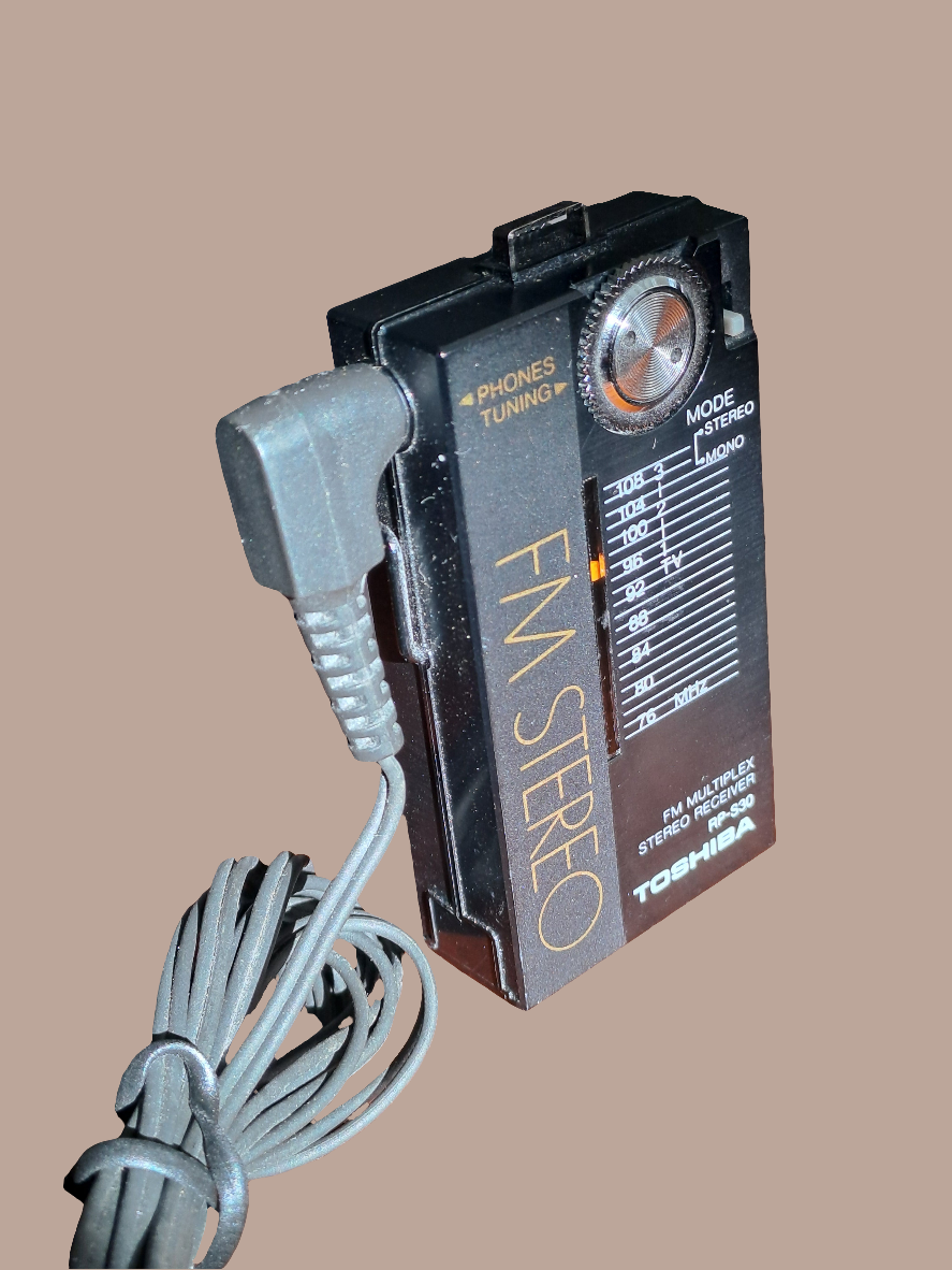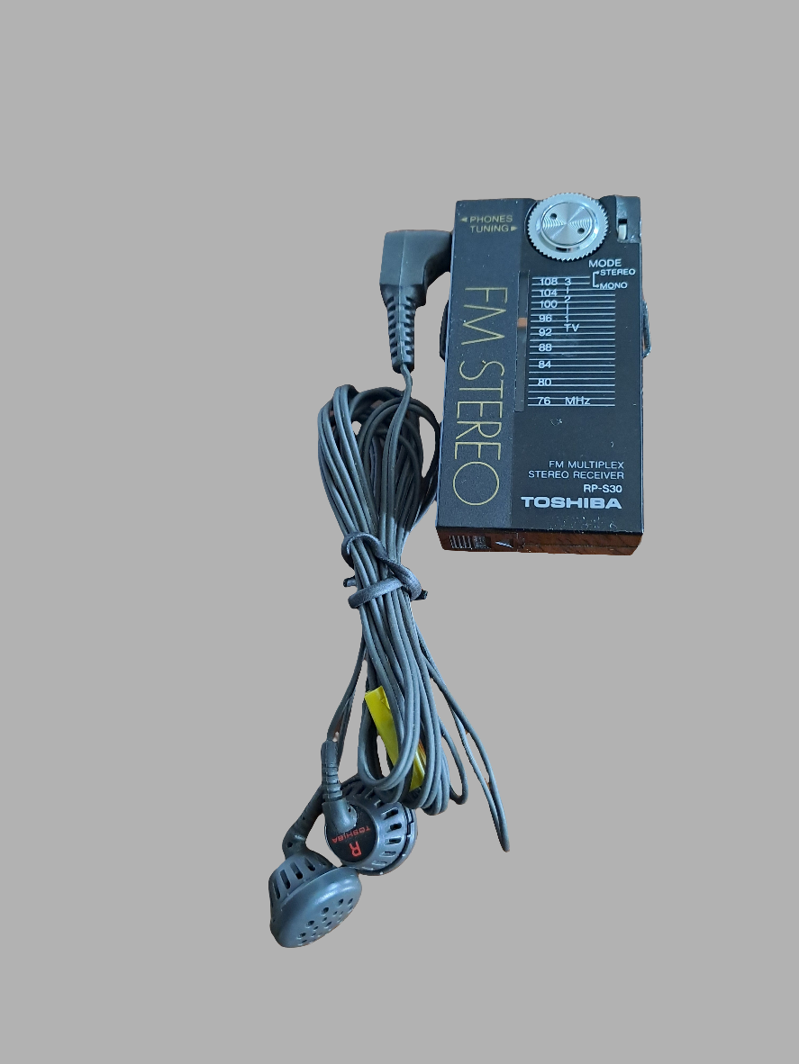 Toshiba FM Multiplex Stereo Receiver RP-S30. Rare vintage mini radio from 1984 in a perfect condition. H: 6 cm. Comes with original headphones and battery.