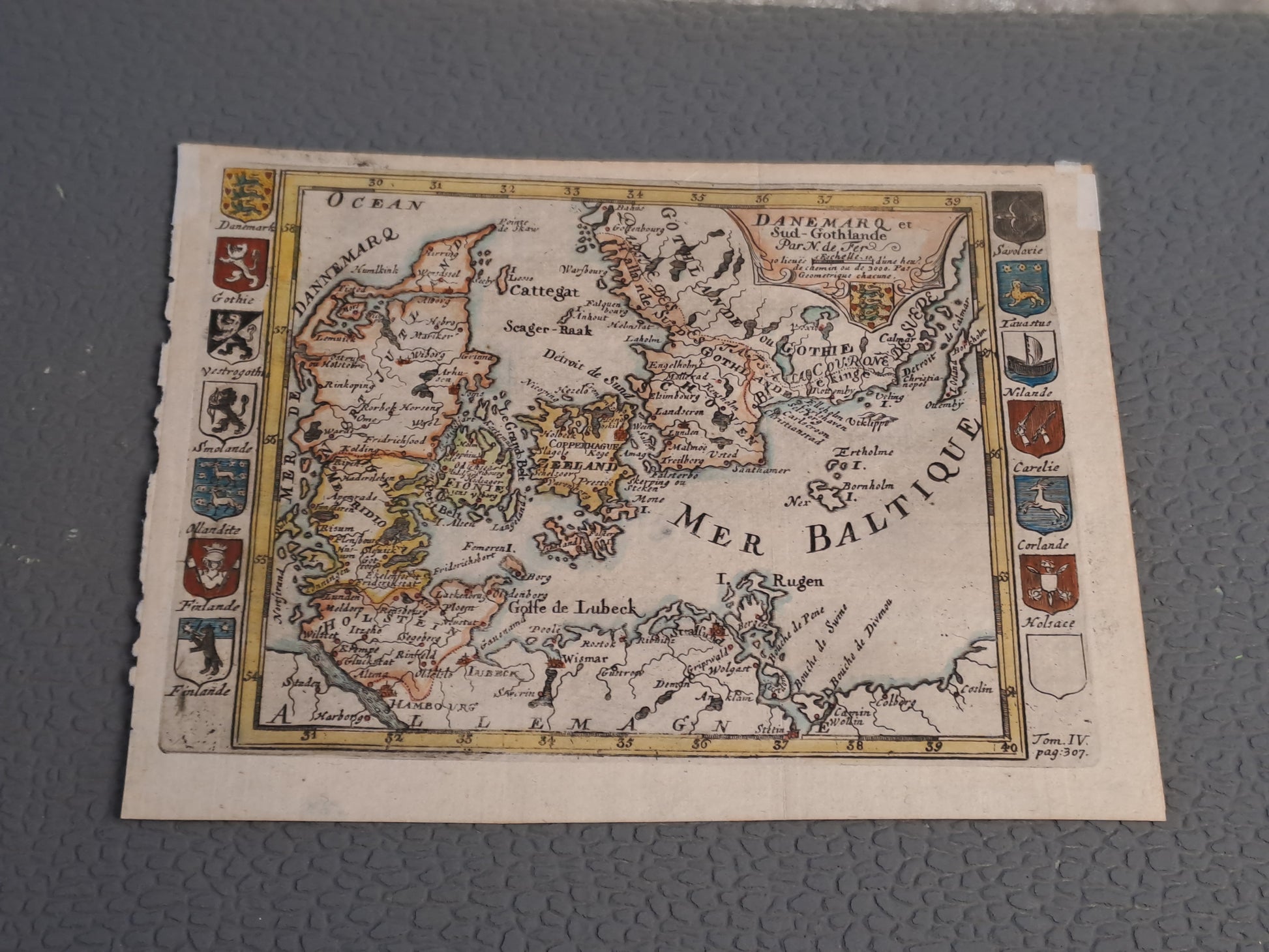 Ultra rare map of Denmark by N. De Fer. This is an original map from 1720. Hand colorated. It's very rare while showing the crests/weapon shields of different regions belonging to the danish kingdom at that time. Here You get a true and exciting ultra rare piece of history."Danemarq et Sud-Gothlande" Par N. De Fer. Made in Paris. Size of the paper itself: 21x15,5 cm. Framed.