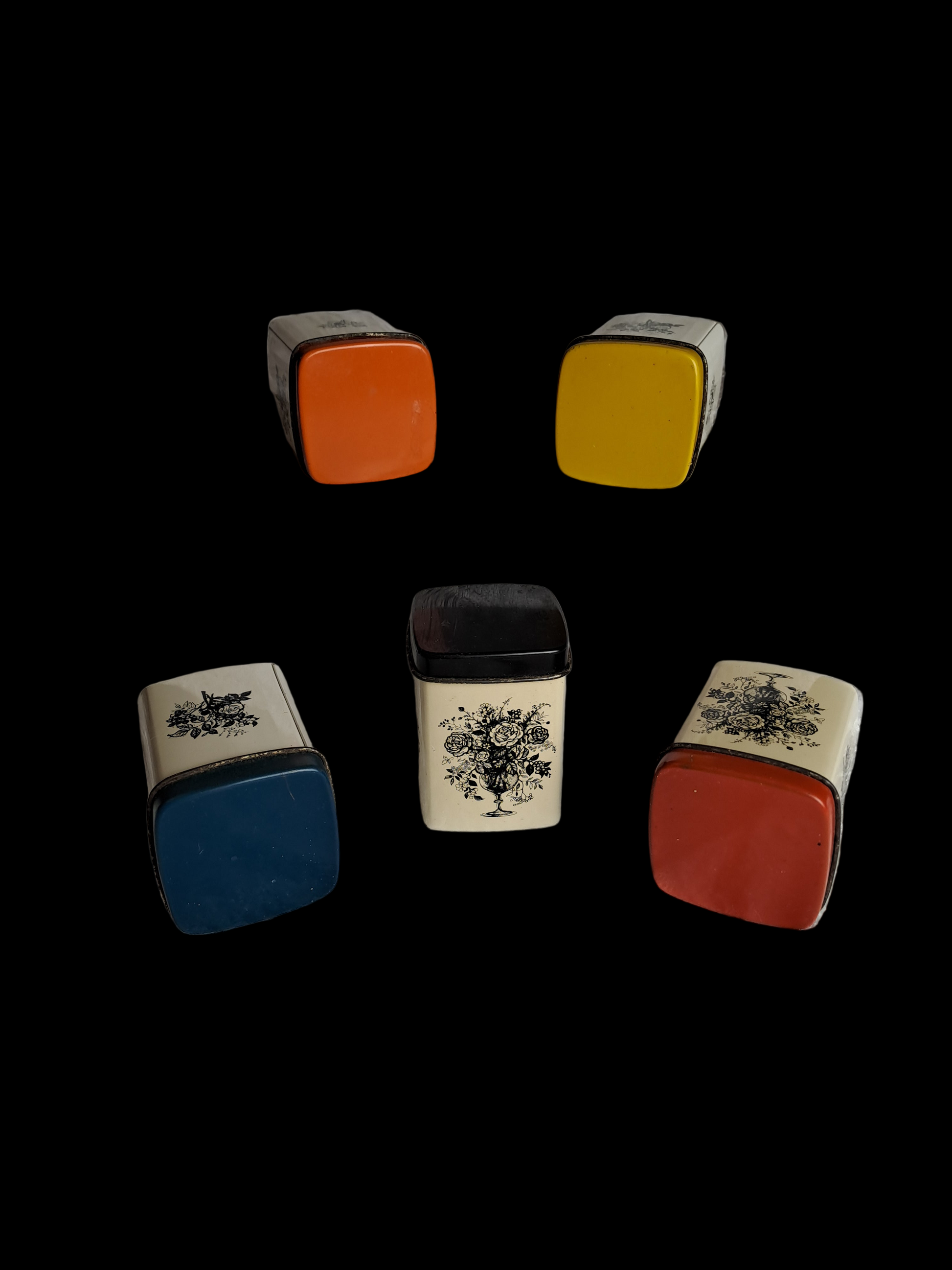 Vintage beholdere med blomstermotiver og låg i forskellige farver. ira Denmark 1960'erne. H:6,8cm.